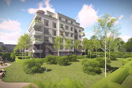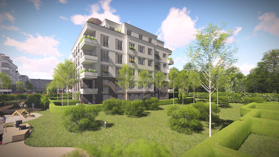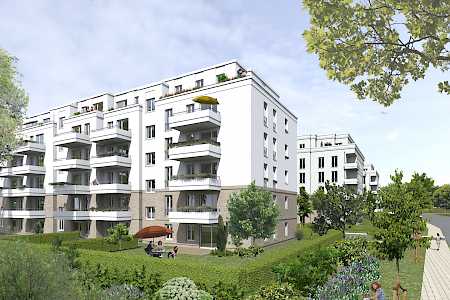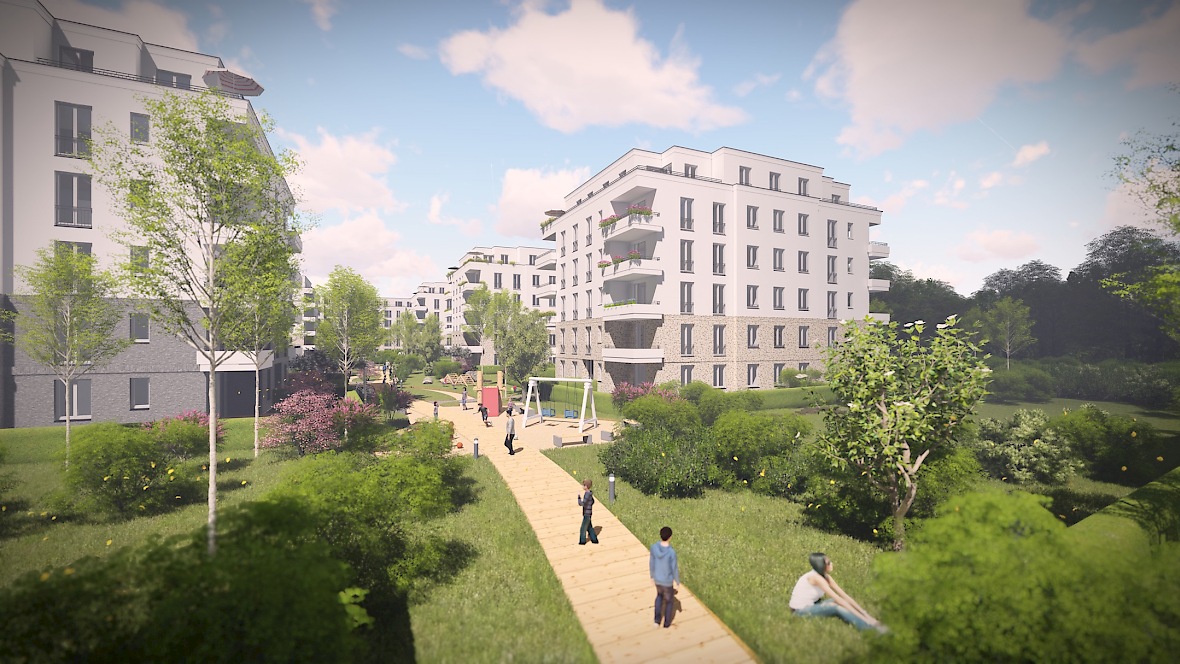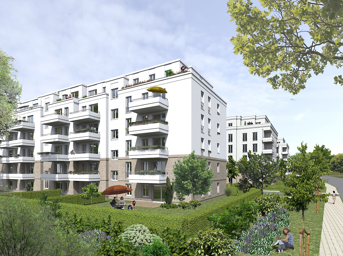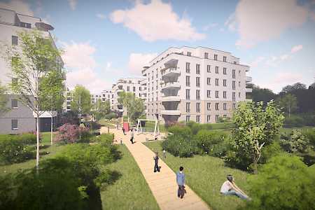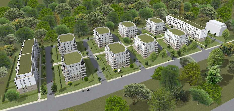 Das geplante Areal in direkter Nähe zum Potsdamer Forst besteht aus zwei Wohnriegeln und neun Wohnvillen mit gemeinschaftlichen Freiflächen mit Spielplatz, sowie einer Tiefgarage mit Technik-, Abstell-, Fahrradräumen.