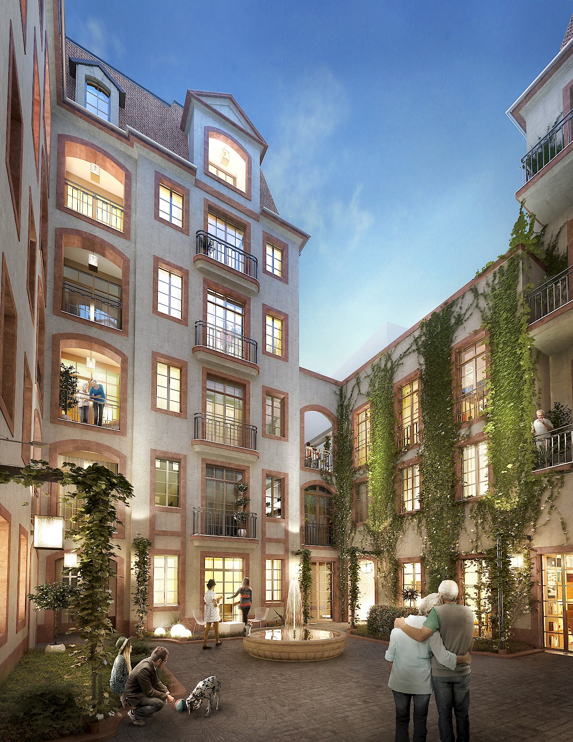 Städtebaulich ist das bestehende Gebäude durch die Gliederung des langgestreckten Komplexes in zwei Innenhöfe unterschiedlichen Charakters geprägt: Der vordere, straßenseitige Hof wird zukünftig eher repräsentativ öffentlichen Charakter haben. Der zweite, intime Hinterhof wird als Wohnoase, inspiriert von den Stadtpalais des Marais, neu interpretiert.
