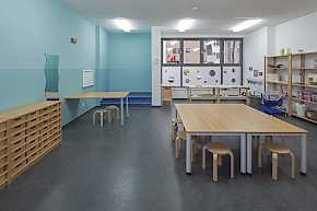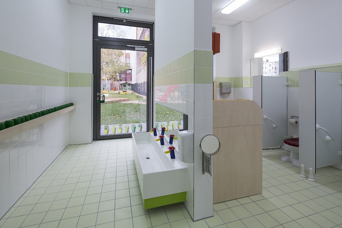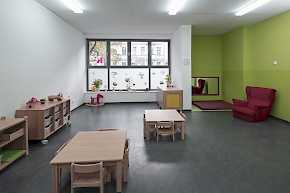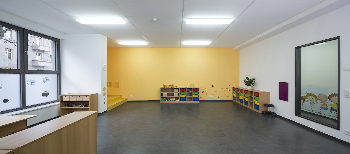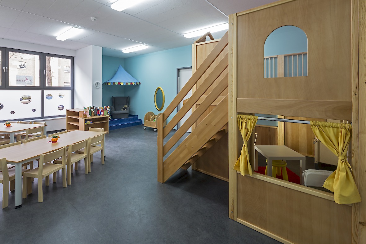 Entstanden sind Gruppenräume für insgesamt 88 Kindern, davon zwei Krippengruppen mit je 12 Kindern und vier Kindergartengruppen mit jeweils 16 Kindern. Die ebenerdige Anlage bietet gute Möglichkeiten, auf die spezifischen Bedürfnisse der Kinder im Alter zwischen Krippenalter und Schuleintritt differenziert einzugehen. Herzstück der Kita ist ein flexibler Projekt-und Mehrzweckraum der im Bedarfsfall unterteilt werden kann.