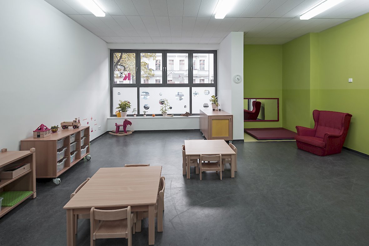 Die Gruppenräume werden über die bestehenden Schaufenster belichtet. Zum Schutze der Privatsphäre der Kinder ist die Verglasung mit einer simplen Folienbeklebung kindsgerecht gestaltet.