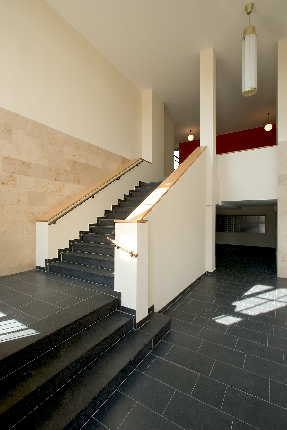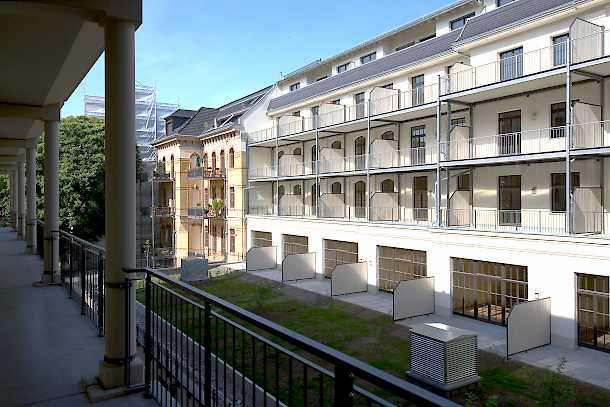 - Die Erschließung findet weiterhin über die denkmalgeschützten Treppenhäuser, verbunden durch Laubengänge statt.