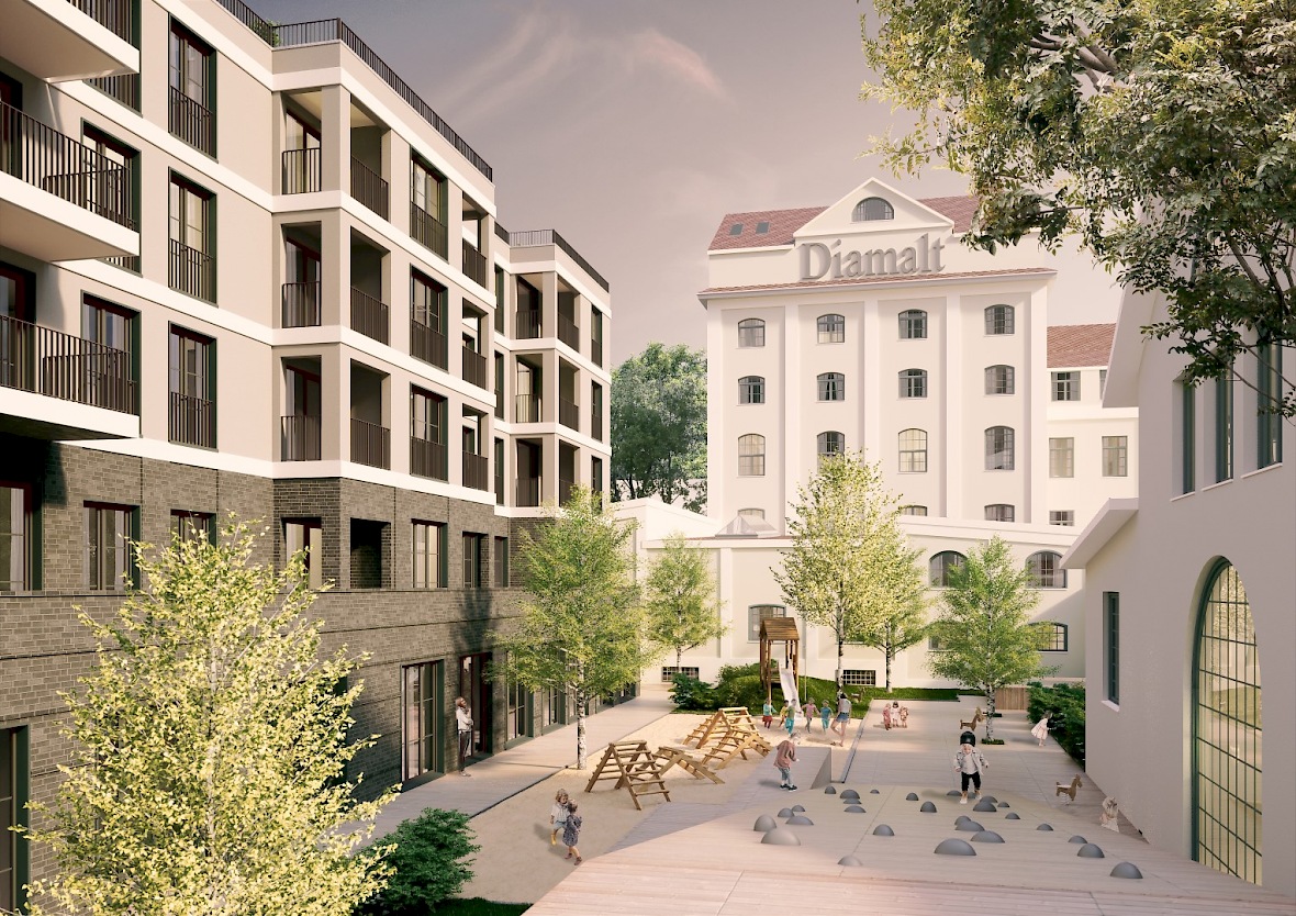 In München Allach soll auf dem ehemaligen Diamalt-Gelände das bestehende Gebäude-Ensemble aus Suppenwürzfabrik und Werkstättengebäude saniert und um ein Gebäude ergänzt werden. Der Neubau, welcher eine KiTa und 17 Wohnungen aufnimmt, ist als gerader Riegel ausgebildet, welcher durch drei vorgestellte Erker und Loggien-Anlagen gegliedert wird. Die Wohnungen sind vorwiegend nach Süden orientiert. Ost-Zimmer erhalten eine verglaste Loggia zum Lüften, um den hohen Ansprüchen an den Schallschutz zu genügen. EG und 1.Obergeschoss sind mit einem Klinkersockel versehen. Darüber schließt sich eine WDVS-Fassade in einem dunkel abgesetzten Putz an, die durch helle Gesimse gegliedert wird.