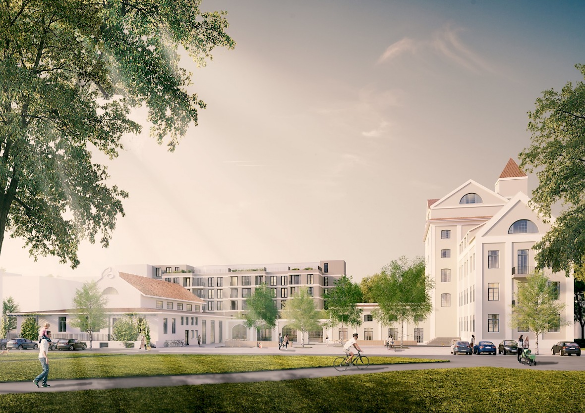 Umnutzung von zwei Fabrikgebäuden zu Wohn- und Bürohäusern und Ergänzung des Ensembles um einen Neubau mit KiTa und 17 Wohneinheiten in München Allach