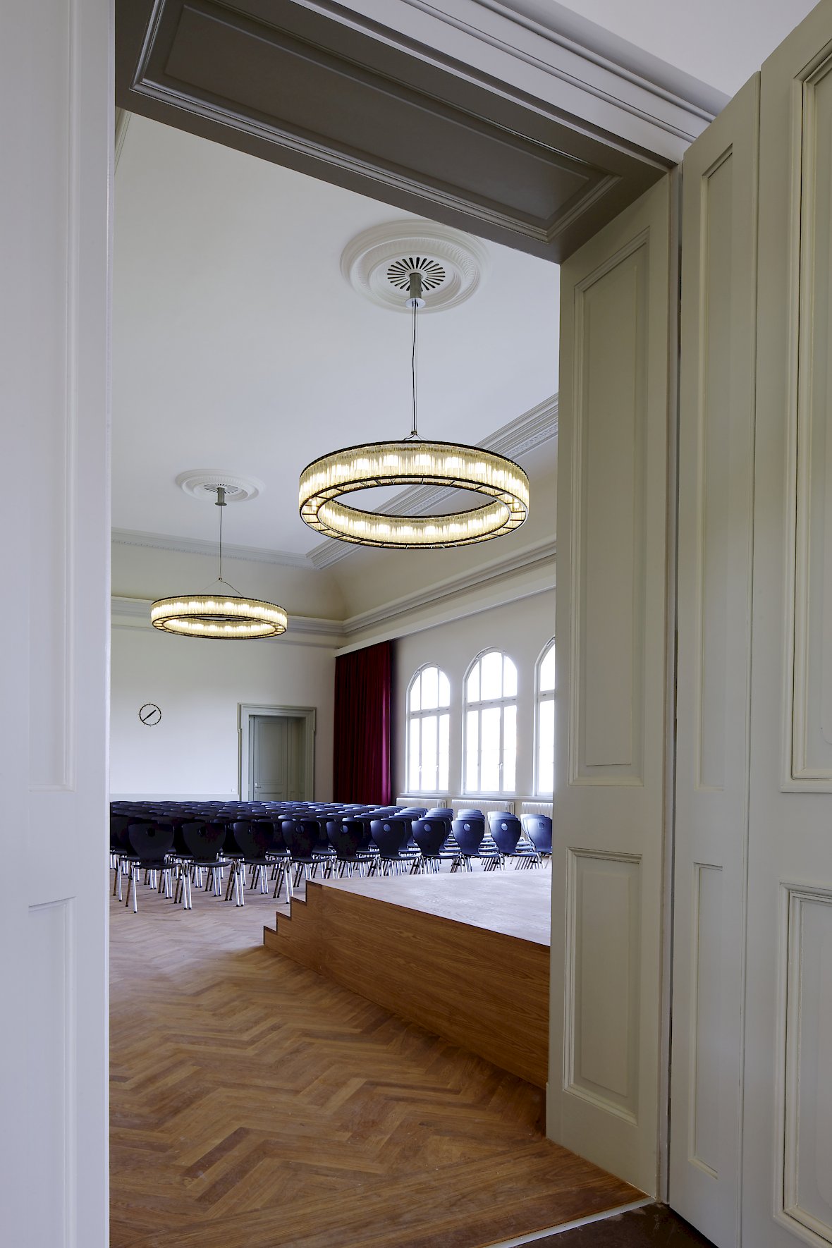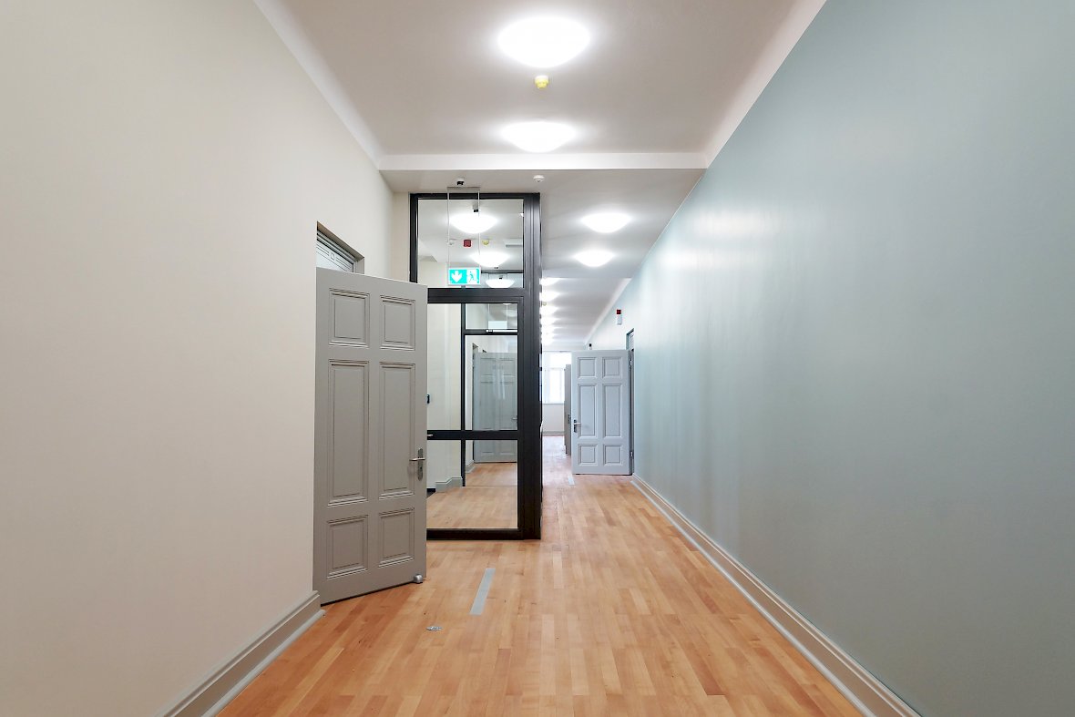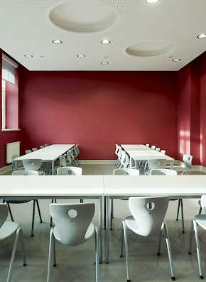 Während die verschiedenen Baustile der Fassade weiterhin bewusst differenziert herausgearbeitet wurden, entwickelten wir für das Innere ein stringentes Farbkonzept, das die verschiedenen Gebäudeteile zu geordneten Einheiten zusammenfügt. Das Farbkonzept bewältigt den Spagat zwischen historischer Reminiszenz und zeitgenössischer Nutzung.