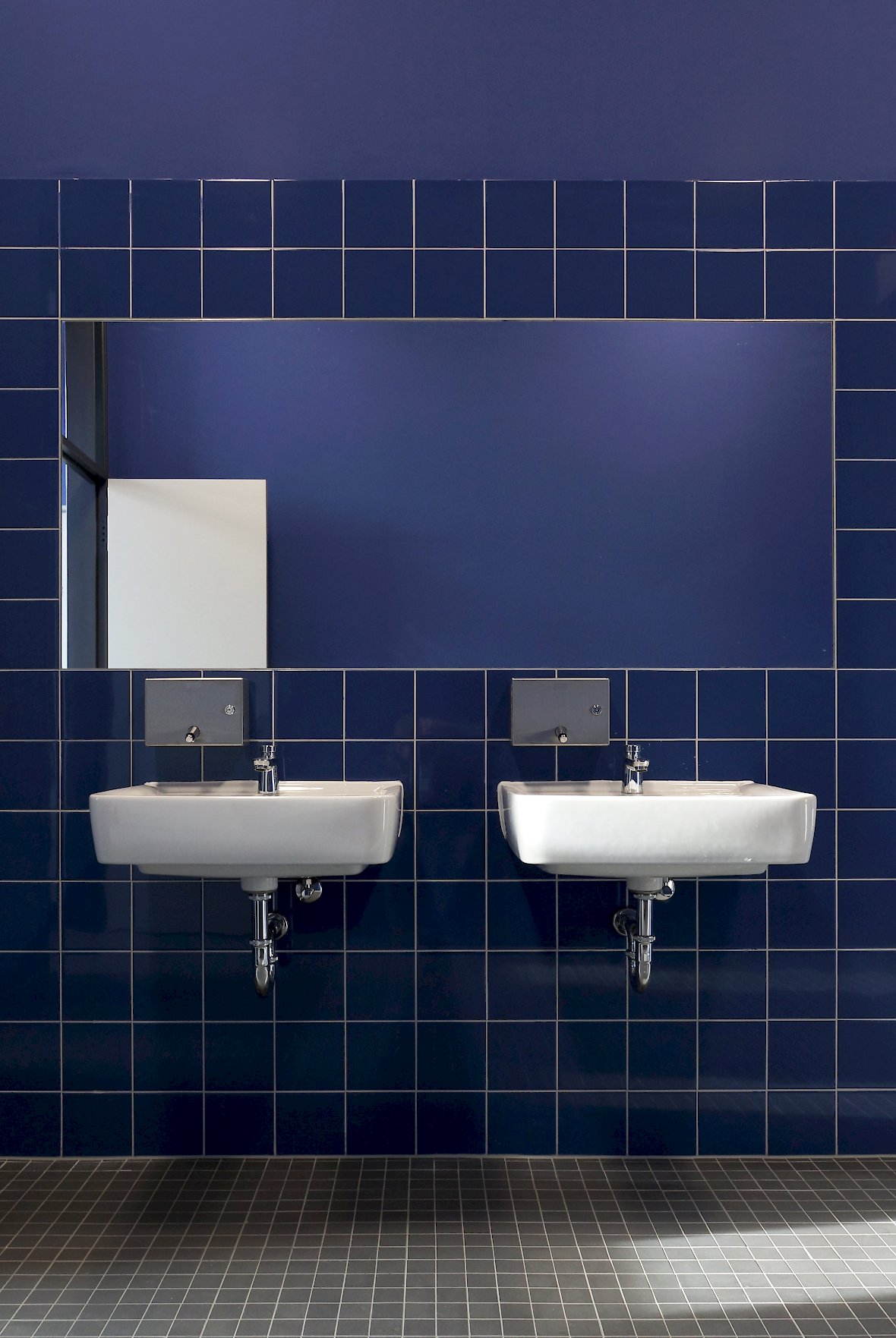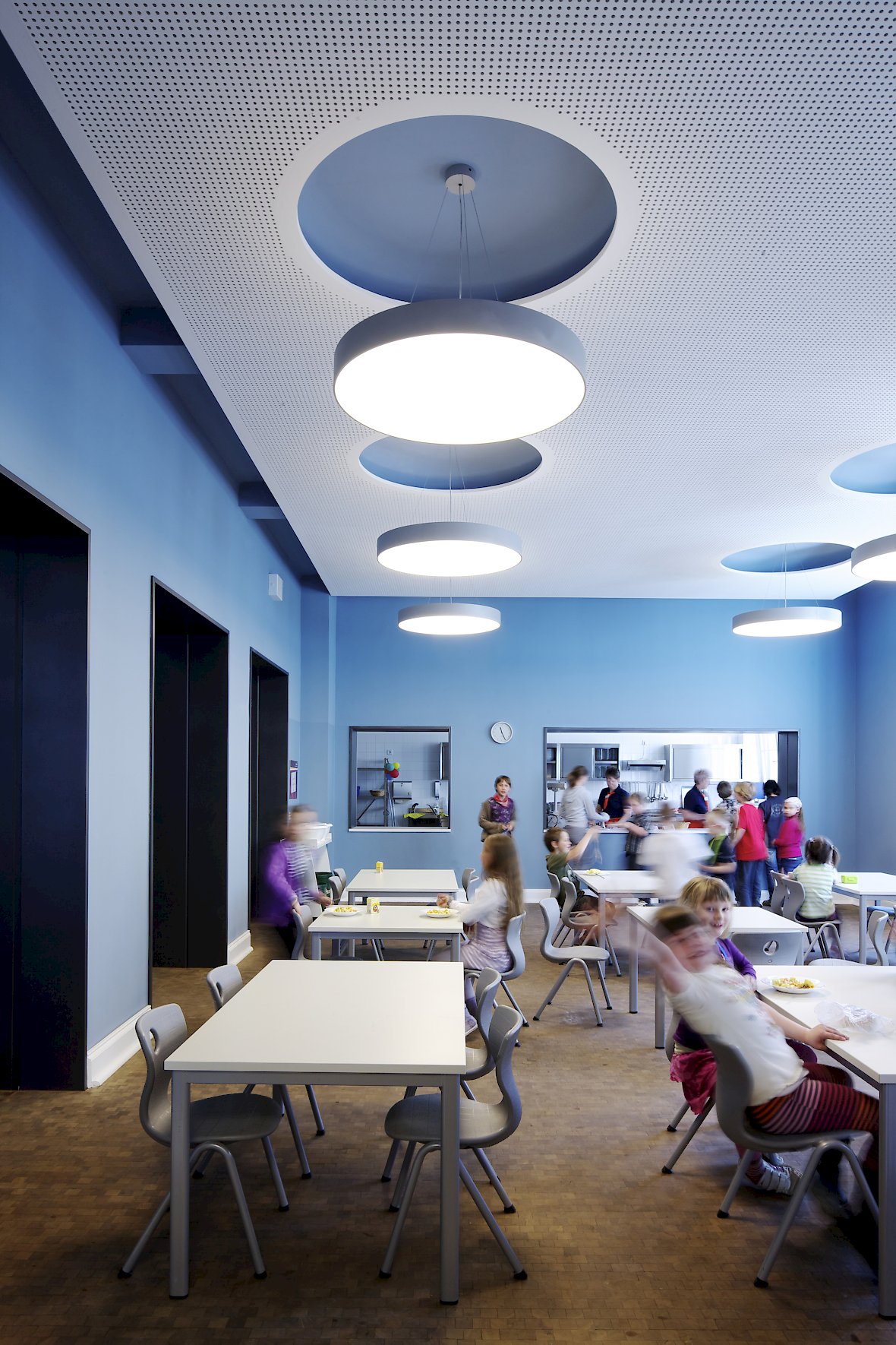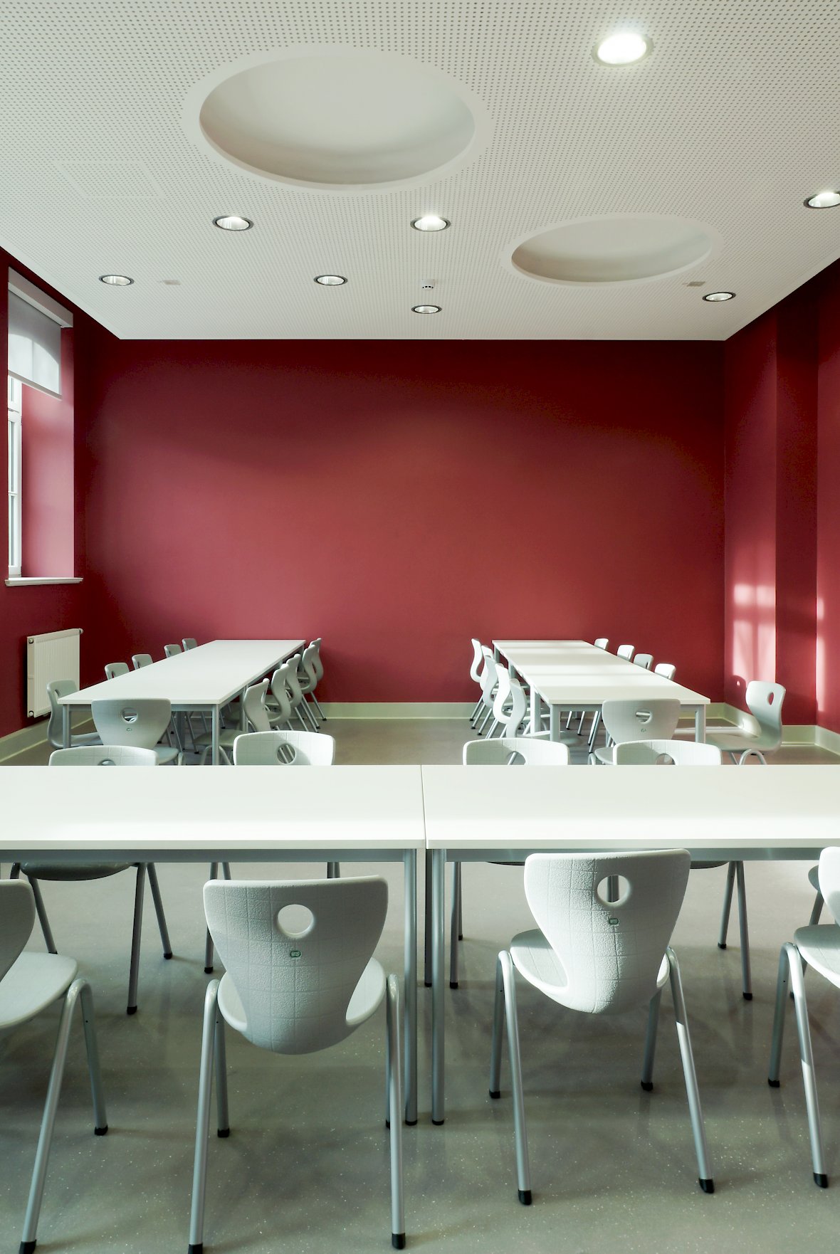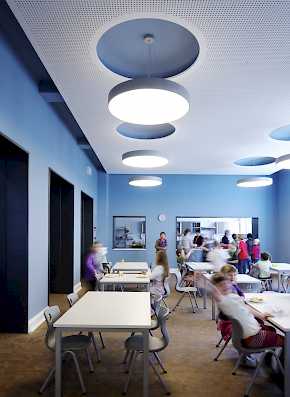 Jeder Flur erhält eine eigene Grundfarbe, die zusammen mit dunkler getönten Varianten und intensiven Komplementärfarben in den Klassenräumen und Bädern die Geschosse wiedererkennbar machen.