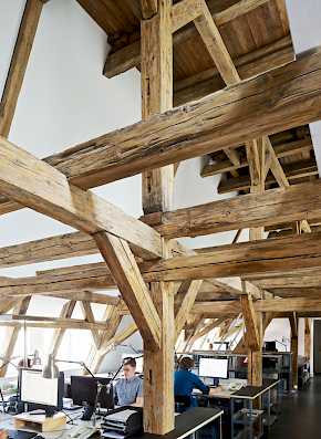 Wir haben das Haus 2013/2014 technisch und funktional grundlegend umgestaltet: in den drei Hofflügeln entstand das Boutiquehotel „Fregehaus“, im Straßenflügel ist seit 2014 unser Büro untergebracht.