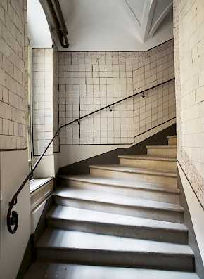 Erforderliche Eingriffe, wie das neue Treppenhaus, wurden klar ablesbar und in einer reduzierten modernen Formensprache entworfen. Hier wurde das Treppengeländer nach historischen Vorlagen im Wasserstrahlverfahren aus patinierten Messingplatten geschnitten.