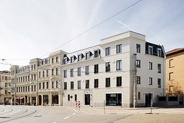 Die moderne Version eines klassischen Stadtwohnhauses vervollständigt nun die durch historische Bauten vorgeprägte Platzsituation um die Friedenskirche.