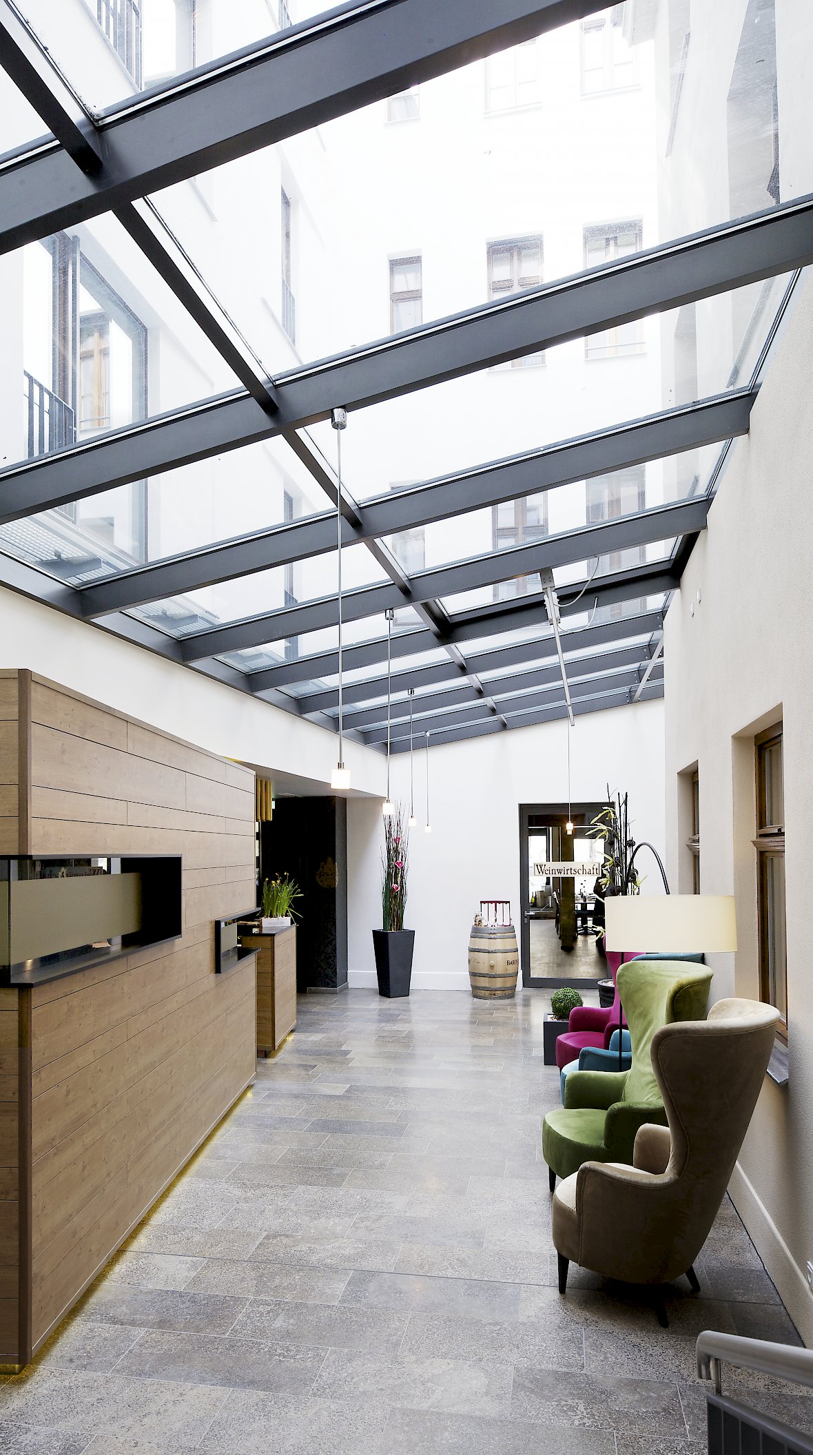 Für ein individuelles Boutique-Hotel mit 52 Zimmern und Suiten, Lobby und Restaurant wurden die drei Gebäudeteile um einen Überglasten Innenhof, in dem sich die Rezeption befindet, zusammengeführt.