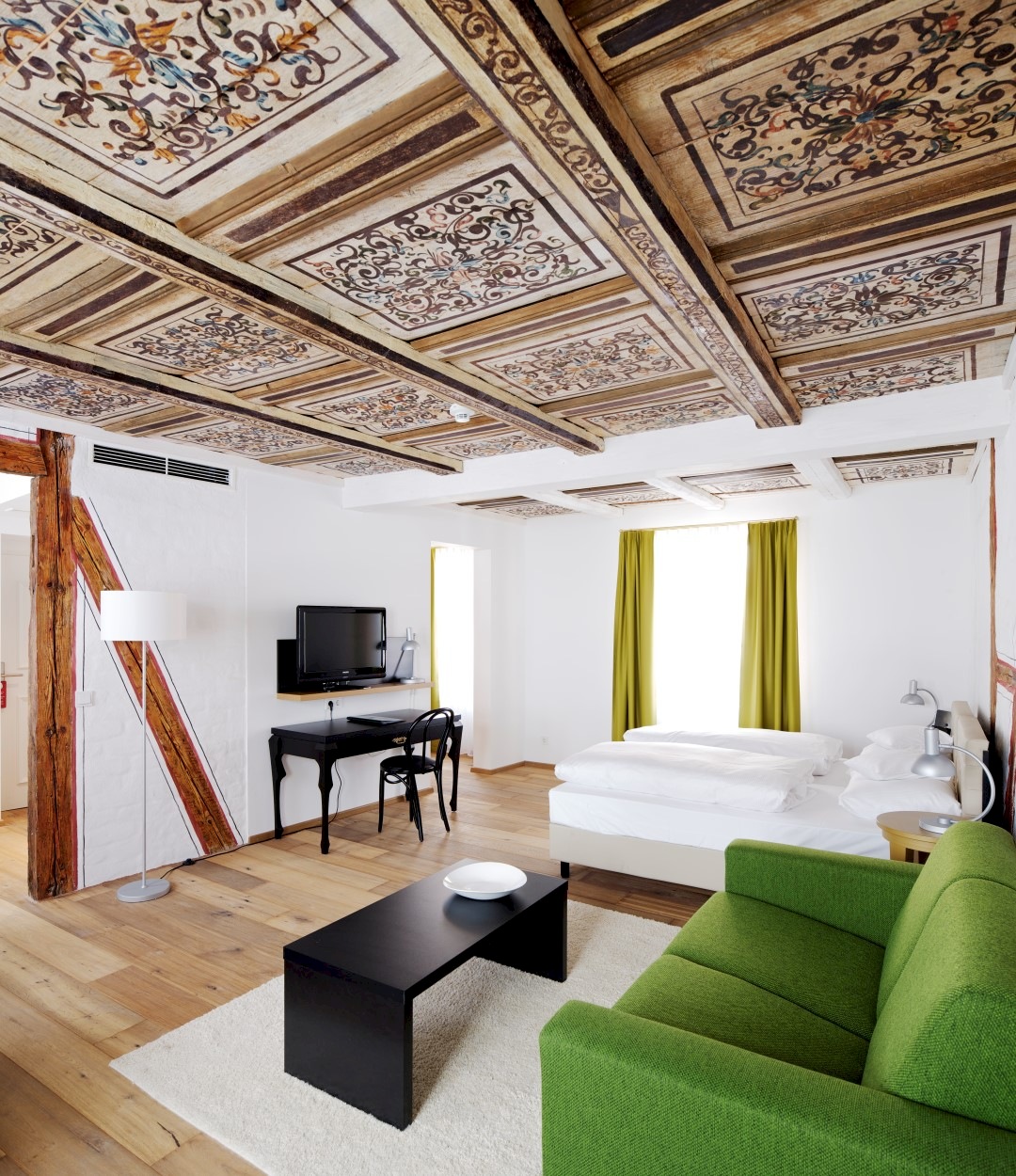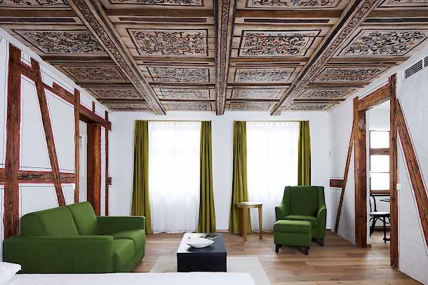 Das Bestandsgebäude wurde behutsam modernisiert. Historische Befunde, die während der Bauarbeiten freigelegt wurden, wie beispielsweise eine bemalte Renaissance-Decke, werden in die Hotelgestaltung integriert. Der moderne Anbau ordnet sich in den historischen Rahmen ein, ohne sich durch modische Zutaten in den Vordergrund zu drängen.