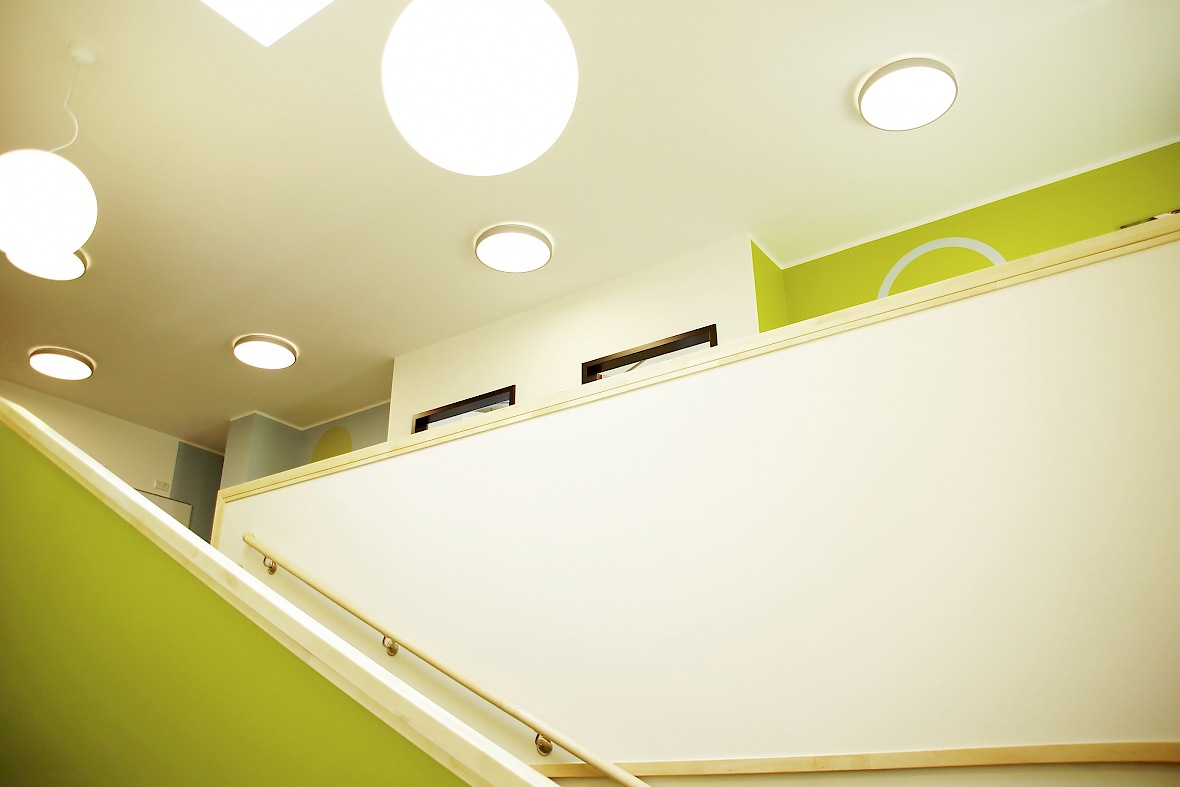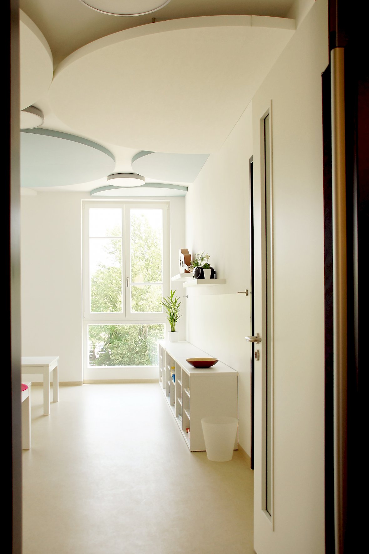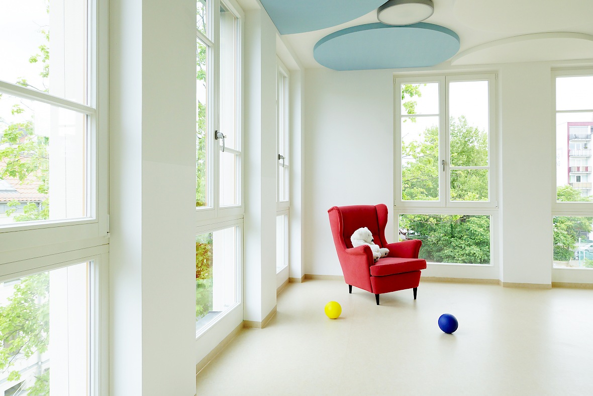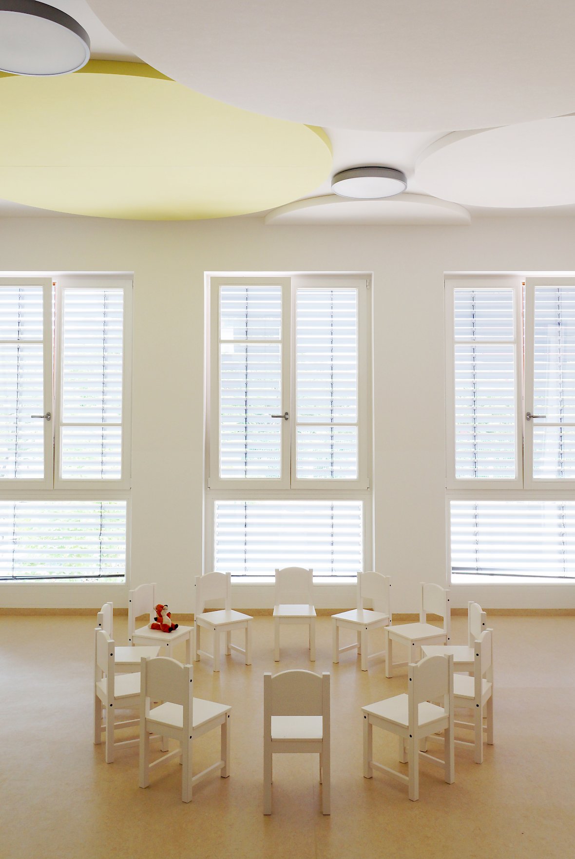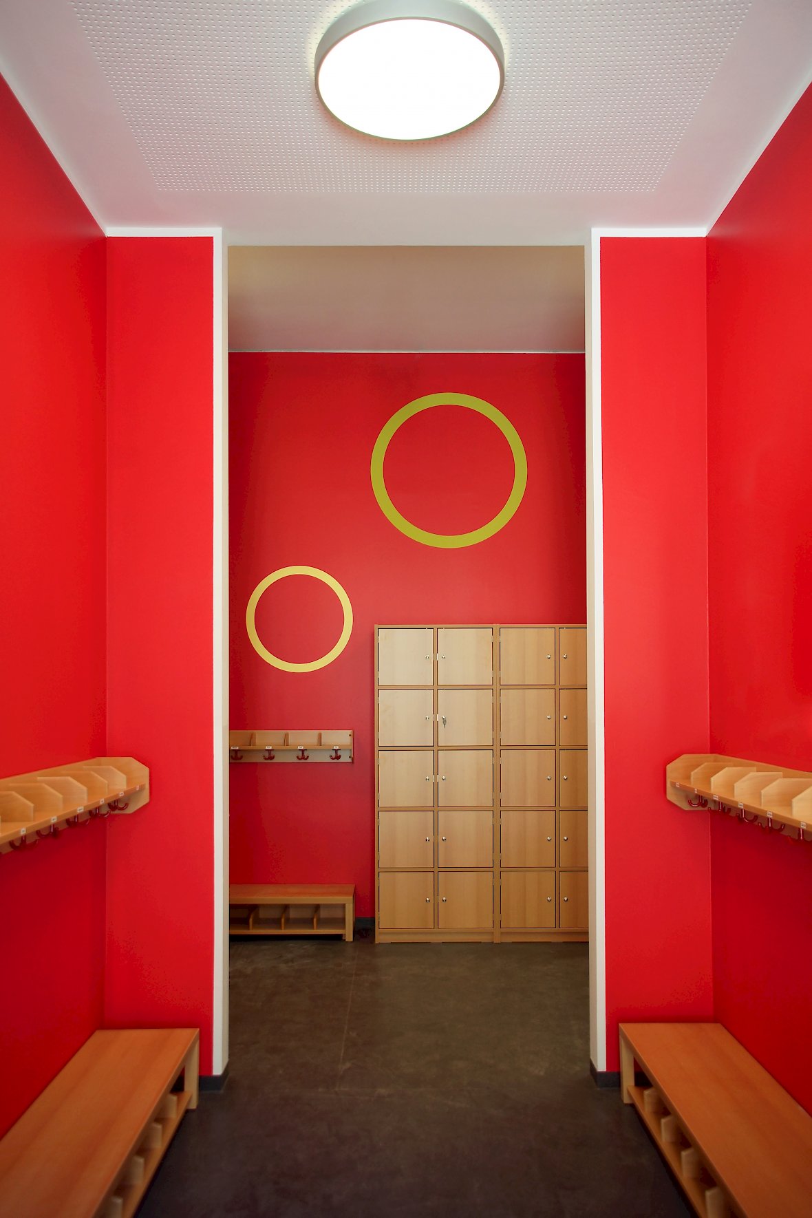 Das Farbkonzept ist angelehnt, entsprechend sportliche Ausrichtung der Kita, an die Olympischen Farben und Ringe, was sich unter anderem auch in den Akustikelementen der Gruppenräume wiederfindet.