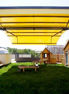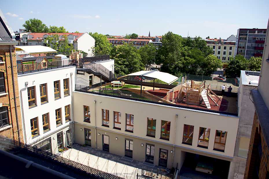 Herzstück der Kita sind die beiden Dachterrassen, die, aus Freiraumtechnischen Gründen erforderlich, aus der normalen Kita eine „städtische“ Kita machen.