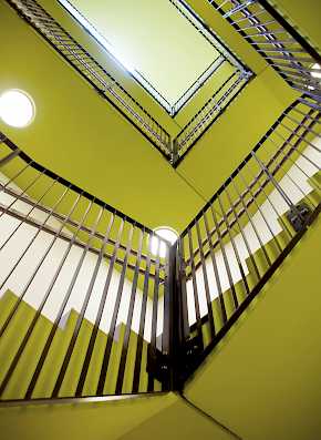 Das Gebäude erstreckt sich über vier Etagen und wird durch ein offenes, repräsentatives Treppenhaus erschlossen.