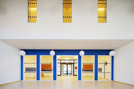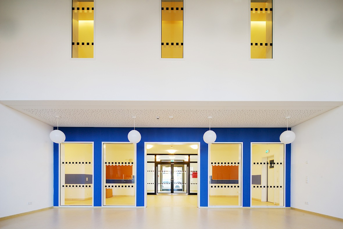 Gestalterisch wurden Elemente skandinavischer Bauweise aufgegriffen und bis zum Interiordesign der Badgestaltung zitiert. Der hohe Baumbestand auf dem parkähnlichen Grundstück macht die besondere Atmosphäre der Freispielfläche aus, die sämtliche Gebäudeteile auf dem Campus verbindet.