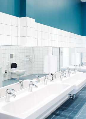 Erschlossen wird das Gebäude über einen großzügig verglasten Eingangsbereich, an den sich das Foyer mit Verbindung zum Mehrzweckraum mit einem Zugang zum Garten anschließt. Die offen gestaltete Raumabfolge: Eingang-Foyer-Mehrzweckraum- Garten gibt dem Gebäude beim Betreten Großzügigkeit und räumliche Identität.