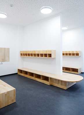 Über den Ausgang mit der Treppe erhalten die Gruppenräume einen direkten Zugang zum Gartenbereich, wodurch der übrige Betrieb der Kindertagesstätte ungestört und sauber bleibt. Straßenseitig finden sich die Funktionsräume, welche nicht für einen dauerhaften Aufenthalt der Kinder geplant sind. Die statische Struktur bildet dabei das Grundgerüst für die Gliederung der einzelnen Funktionen.