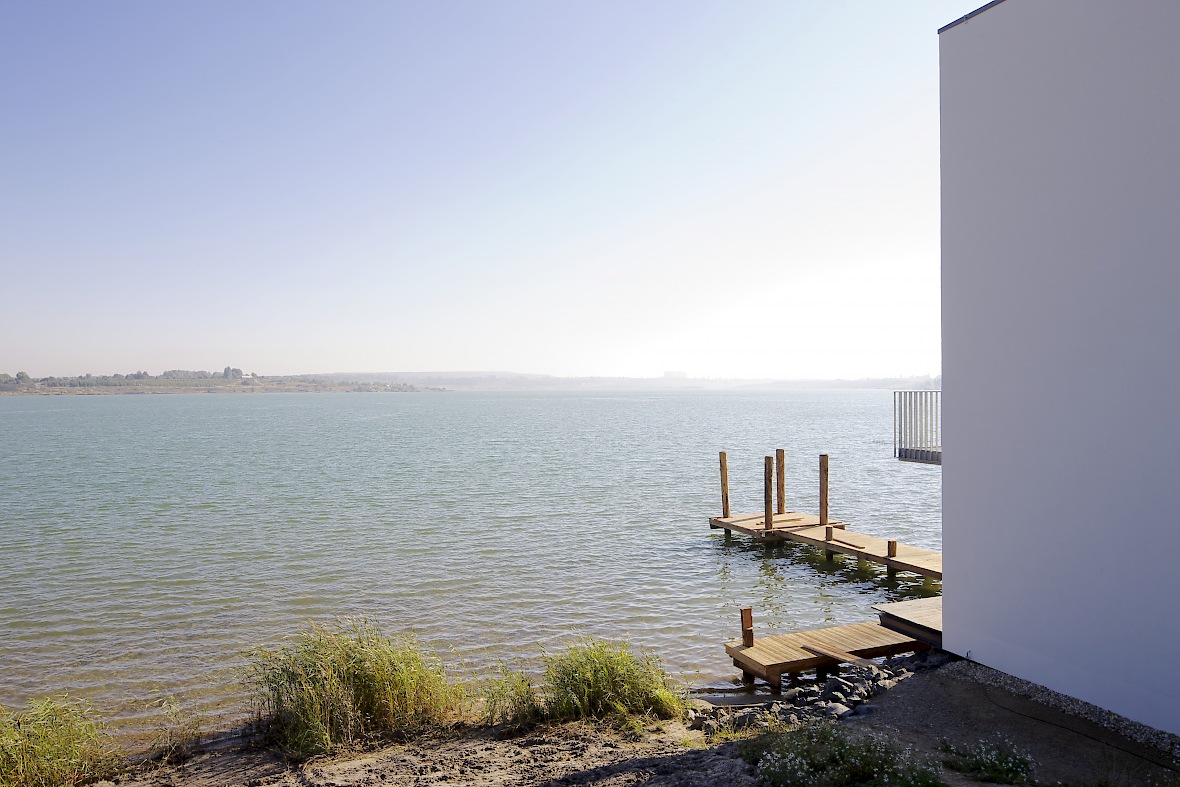 Das dreigeschossige Gebäude orientiert sich mit seinen Terrassen und Balkonen Richtung Osten direkt zum Wasser hin und bietet so einen wunderschönen Blick auf den See. Ein hauseigener Bootssteg schließt direkt an die Terrassen der Ferienwohnungen an.