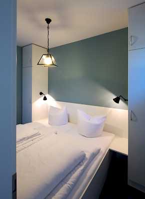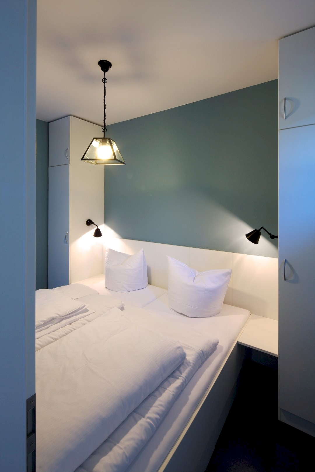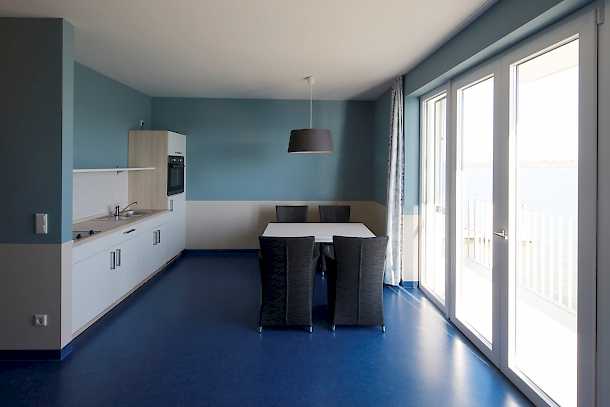 Die Appartements werden rückseitig über einen offenen Laubengang erschlossen und verfügen jeweils über eine kleine, kajütenartig anmutende Schlafkabine und ein Bad mit Dusche, sowie einen großzügigen Wohnbereich mit offener Küche und Zugang auf den Balkon bzw. Terrasse Richtung See.