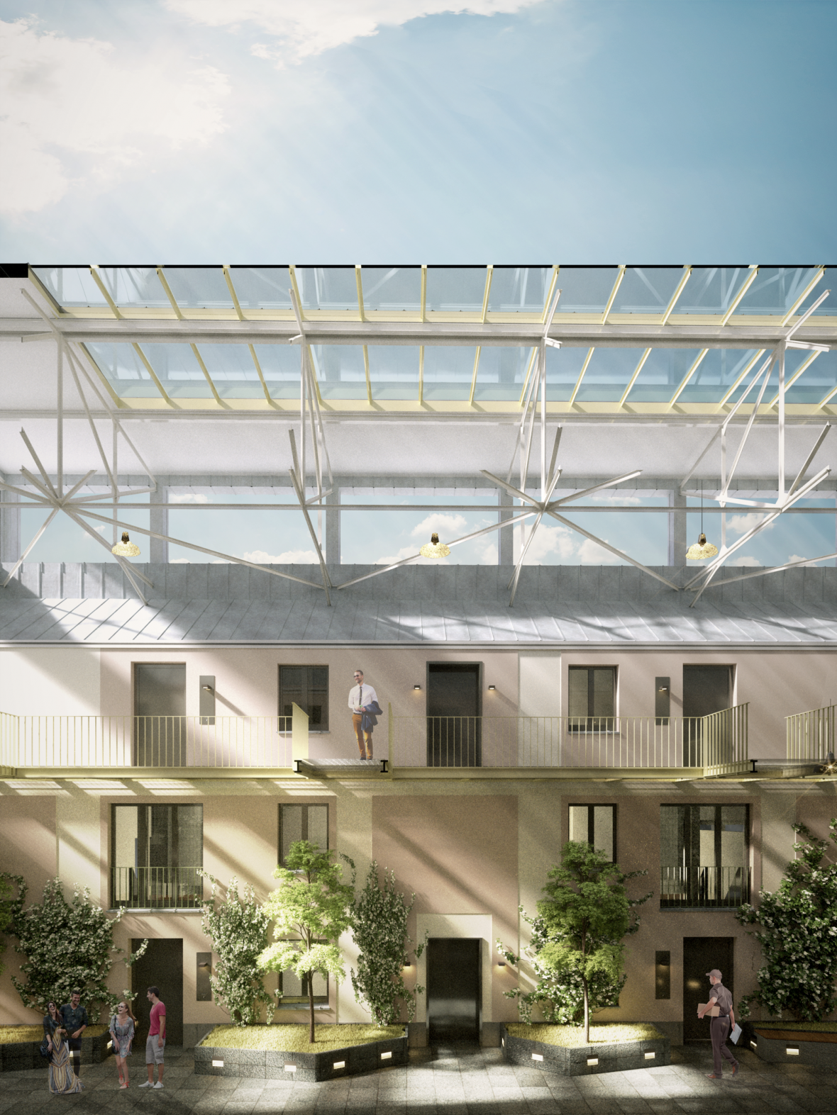 Die Wohnungen sind über eine Laubenganganlage mit Fahrstuhl und Atrium verbunden. Die Belichtung des Atriums erfolgt über vorhandene Oberlichtbänder. Ein Großteil der Wohnungen erhält Freisitze in Form von Loggien oder Terrassendecks.