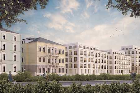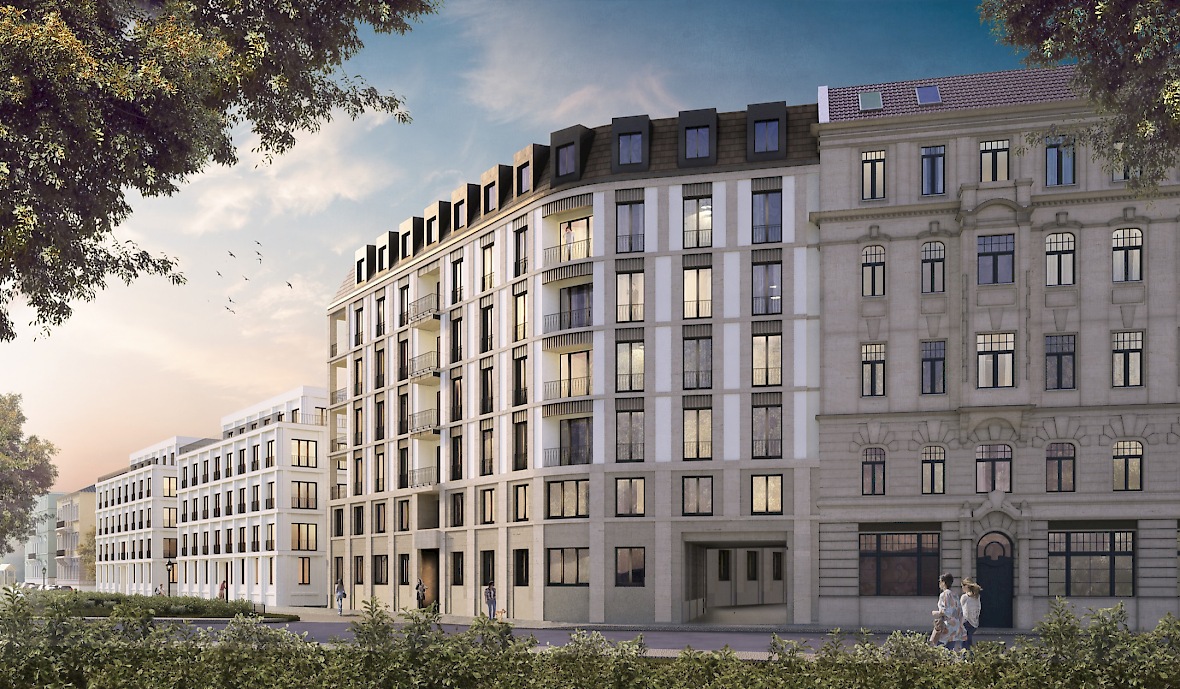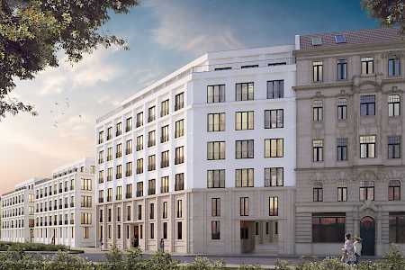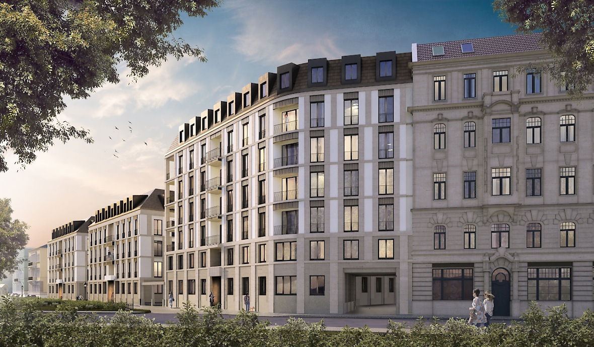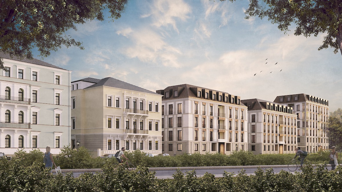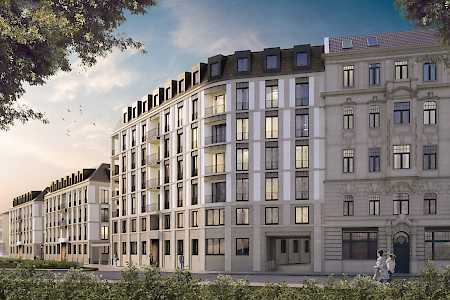 Neubau zweier Villen und eines Eckhauses als Abschluss der „Königshöfe“ in Dresden in der Theresienstraße 6