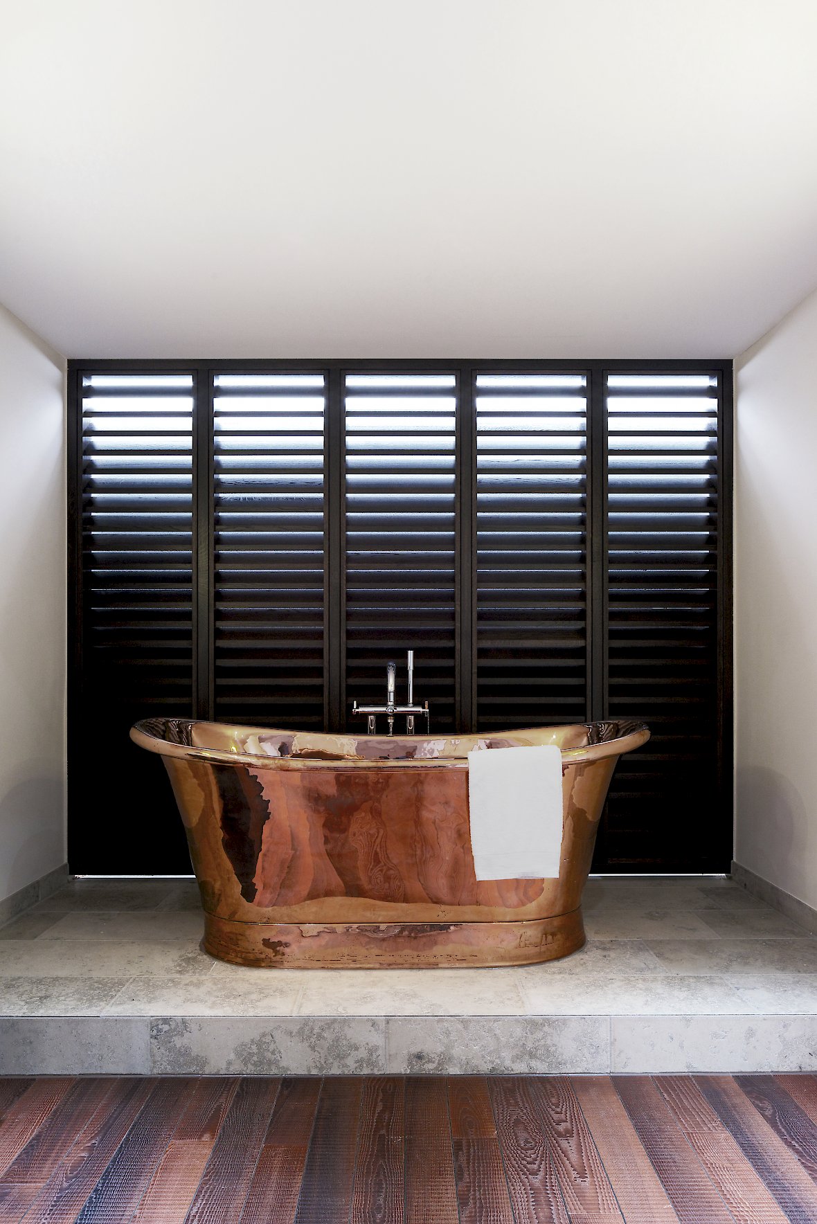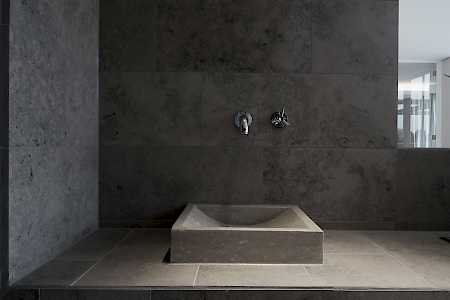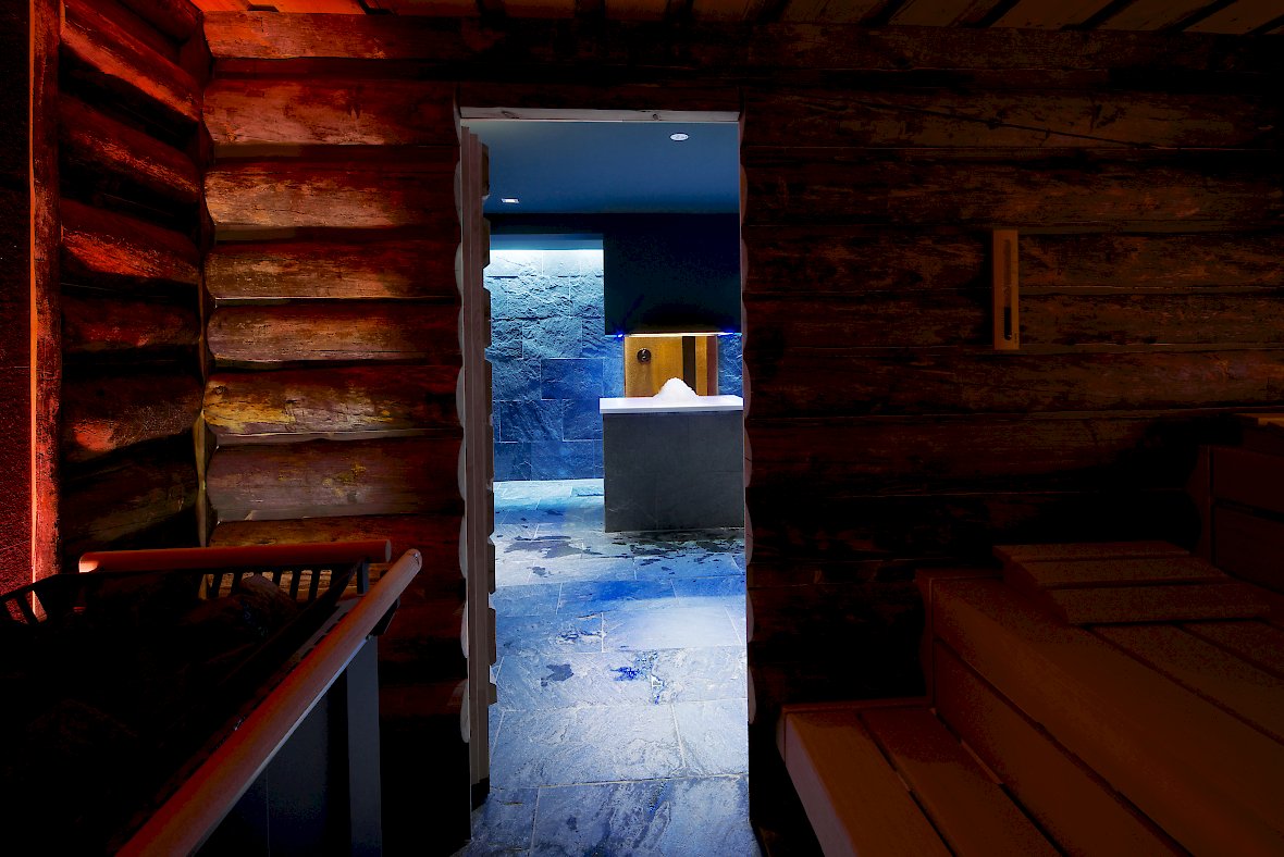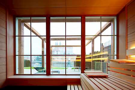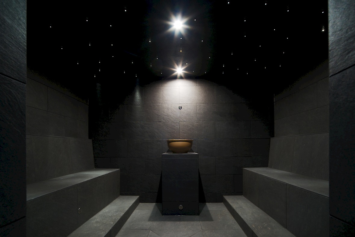 Der dunkel gehaltene Sauna-Bereich hingegen stellt die rauen Naturelemente in den Mittelpunkt: Hitze, Dampf, Wasser und Eis. Die Wärme der finnischen Sauna aus Altholz trifft dabei auf die Kühle des Eises und des schroff gespaltenen Quarzits. Ruhe und Privatheit bieten die Kojen aus gewaschenem Rohleinen mit einem unverwechselbaren Ausblick auf die Elbe und die Burg.