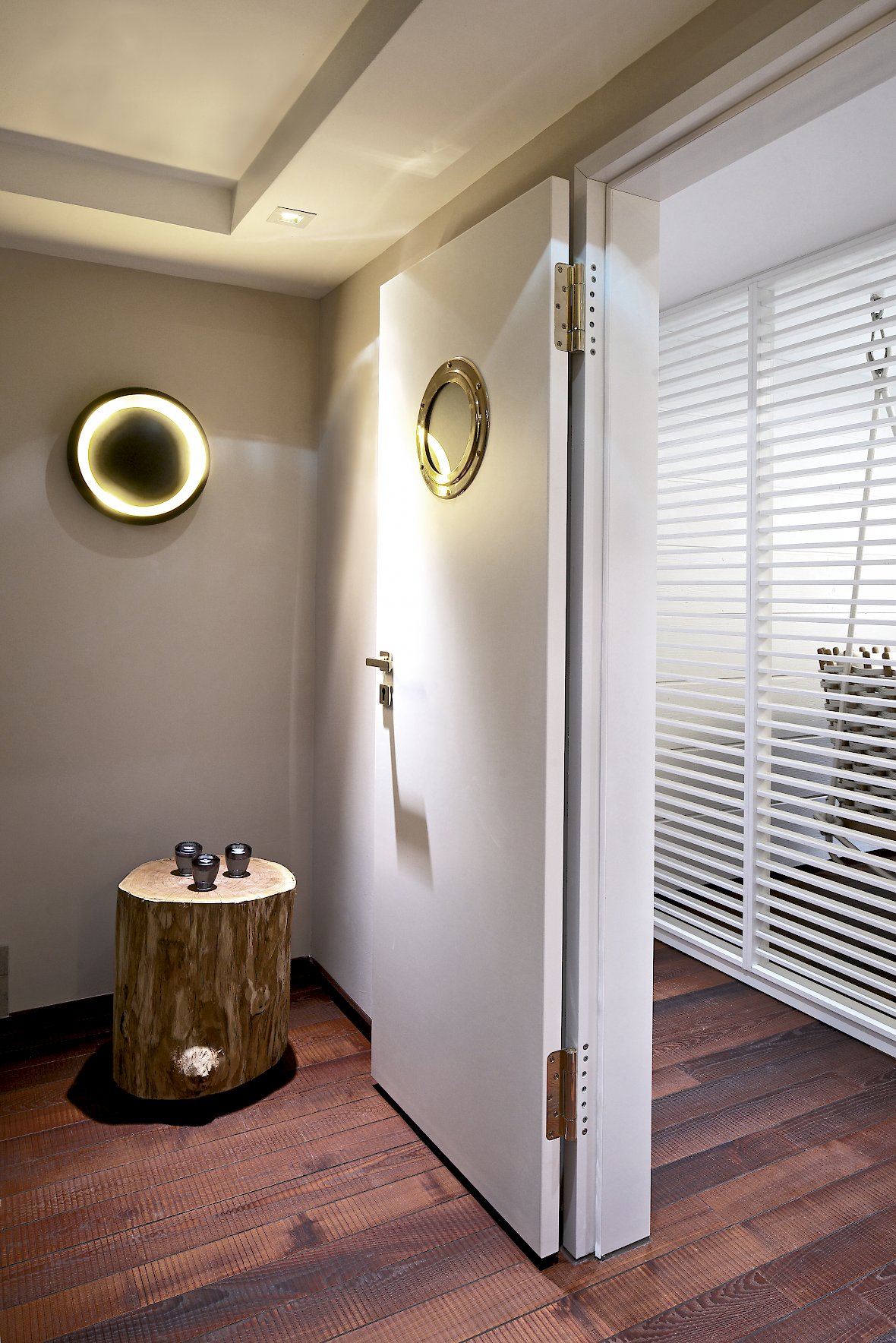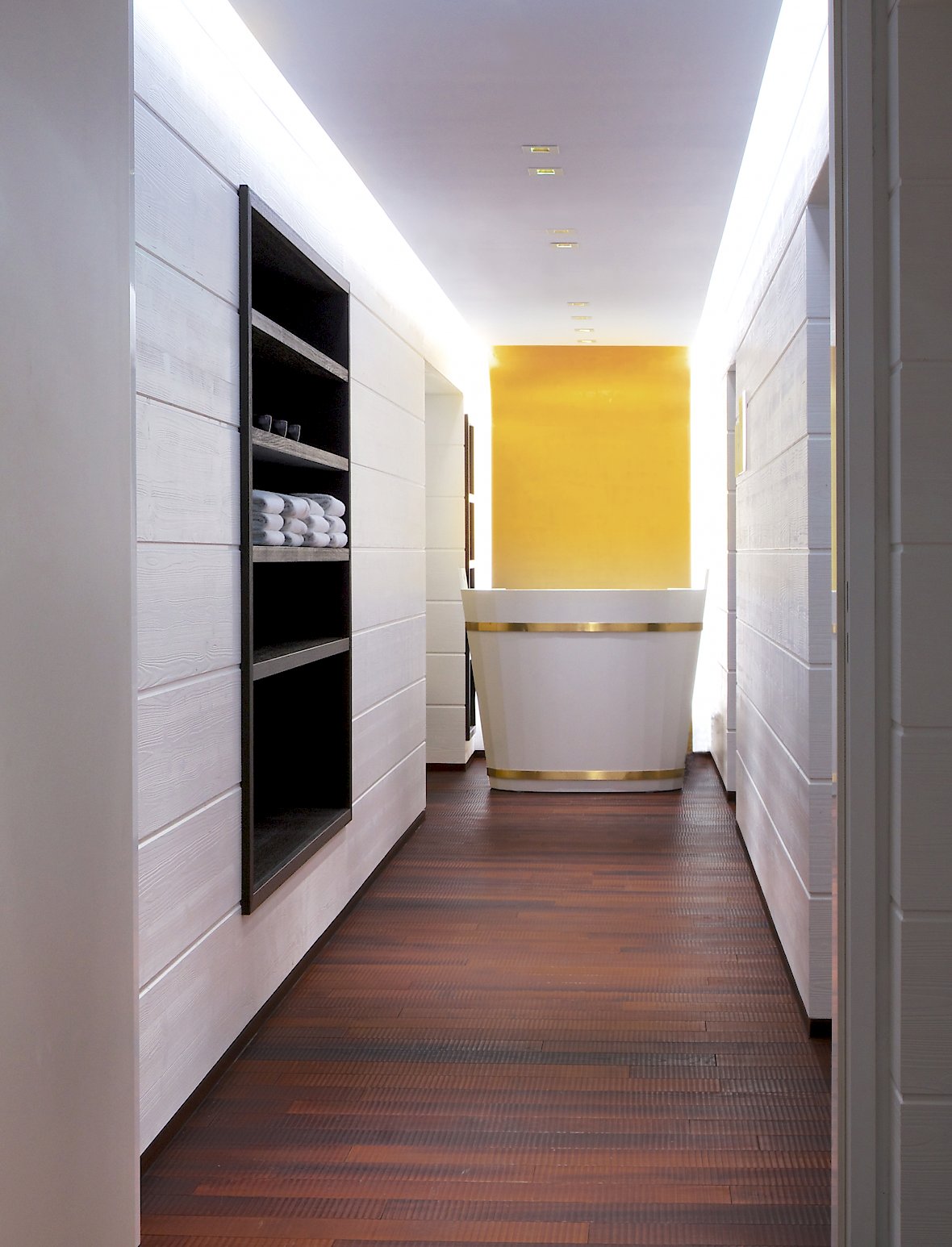 Das 4-Sterne Parkhotel in Meißen erweitert das Serviceangebot um einen SPA Bereich. Die Herausforderung bestand darin, trotz räumlicher Begrenzung ein Konzept zu finden, welches den Besucher in die Welt der Entspannung entführt und die Einzigartigkeit des Ortes - den Ausblick auf die Albrechtsburg - inszeniert. Hierfür wurde der „Verduta“-SPA in drei Bereiche eingeteilt: Der Empfang und Behandlungsräume erinnern mit Ihrem dunklen Schiffsdielenboden und Messingbullaugen an die Ästhetik der Elberaddampfer. Für ein Gefühl an Häuser am Meer mit Frische und Luftigkeit sorgen die weißen, holzverkleideten Wände, welche auch die notwendigen Einbaumöbel und Türen zusammenfassen. Alle Wellness - Behandlungsräume fokussieren außerdem mit Motivtapeten auf die Decke - das Auge verweilt wie bei einem Trompe-l’oeil.