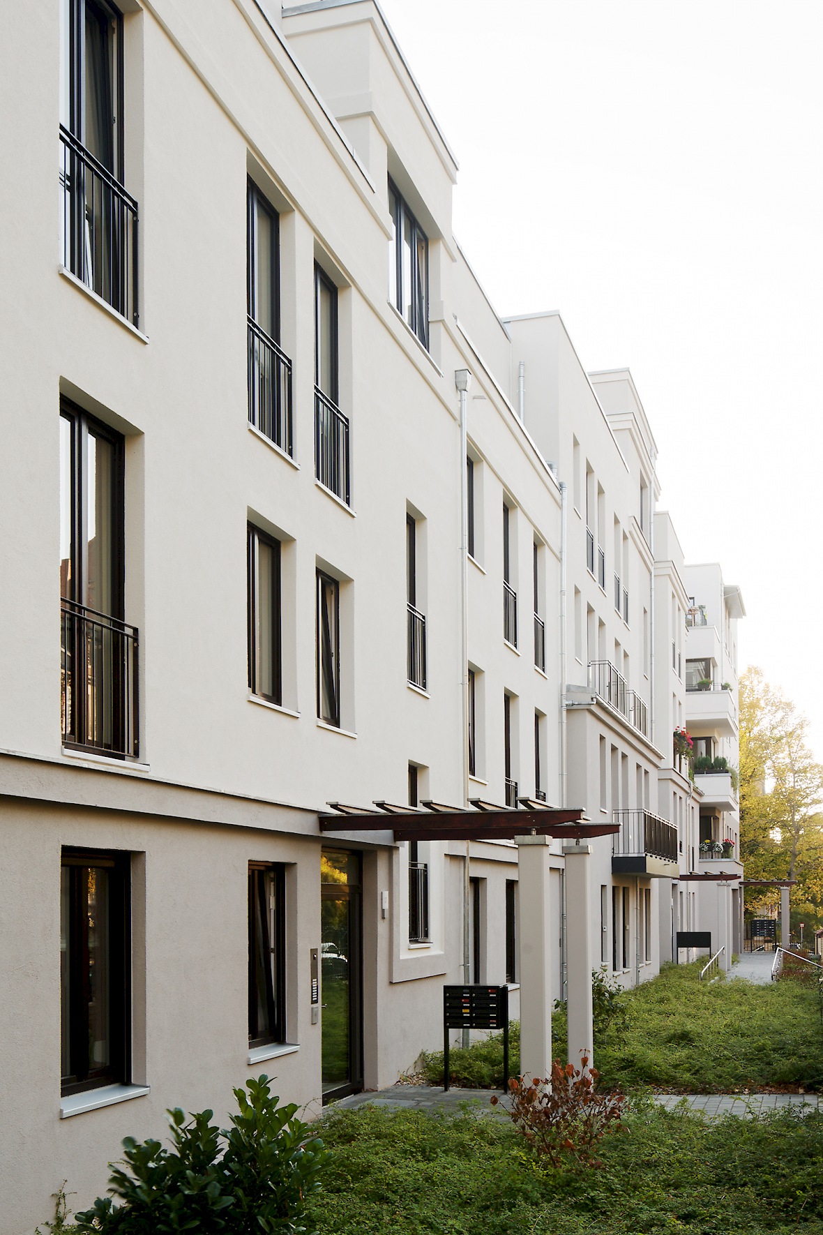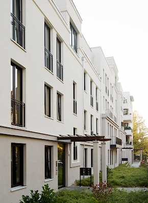 Der Blockrand des ehemaligen Parks wird durch die Geschosswohnungs-Neubauten gefasst. Die sechs ablesbar selbständig gestalteten Einzelgebäude nehmen den Rhythmus und Maßstab der umgebenden Bebauung auf, hier entstehen 62 Wohnungen zur Vermietung. In der angeschlossenen Tiefgarage befinden sich 68 Stellplätze.
