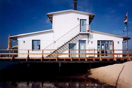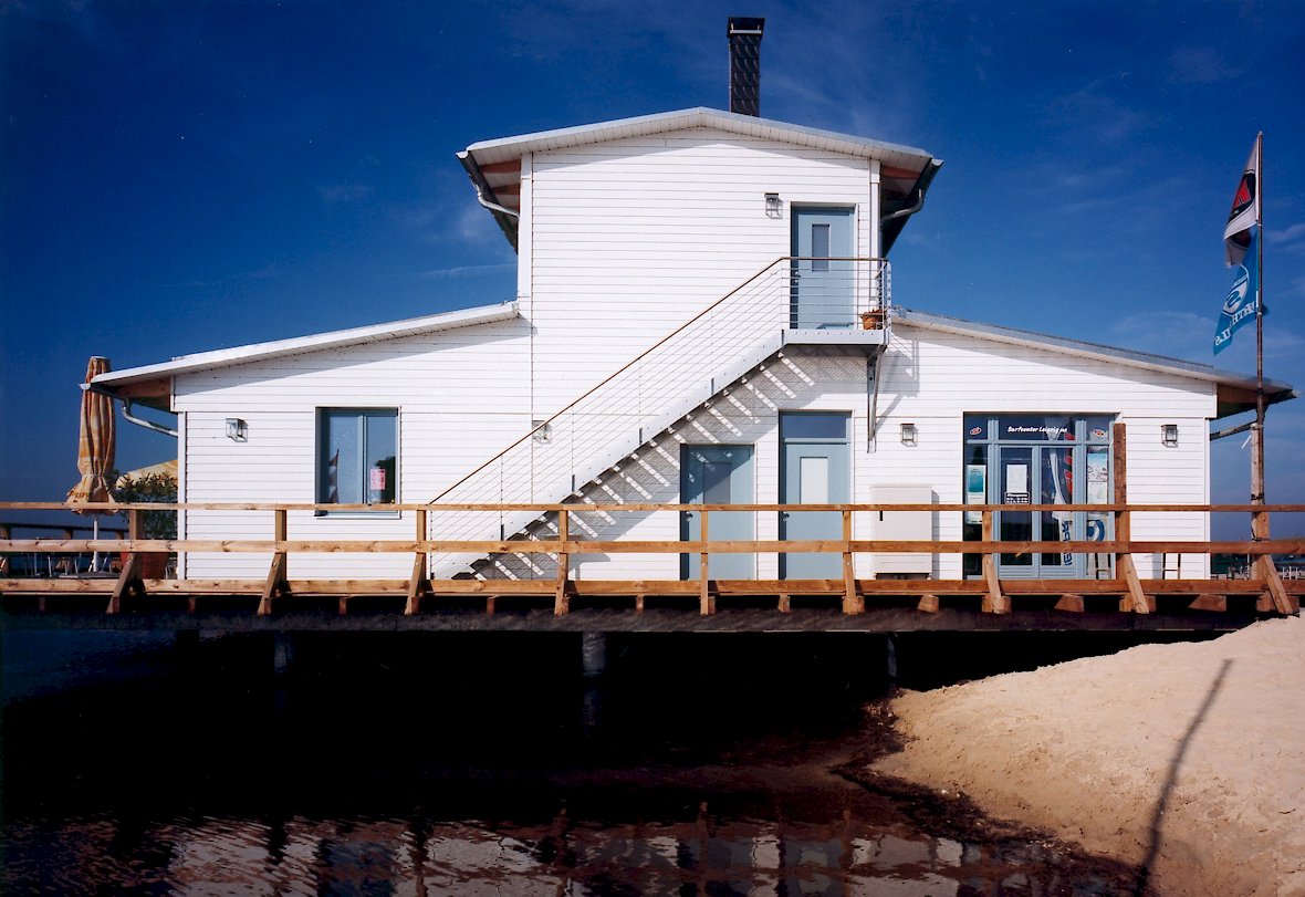 Wir fanden die Hafen-Idee spannender und haben mit der neugegründeten „Pier 1 GmbH“ das Konzept des Segelhafens mit Freizeitangeboten vom Tauchstützpunkt über Surfregale bis zur Sauna im See sowohl inhaltlich als auch architektonisch entwickelt. Bautechnisch war die speziell entwickelte Unterwasser- Stützengründung auf der ehemaligen Kippe die größte Herausforderung.