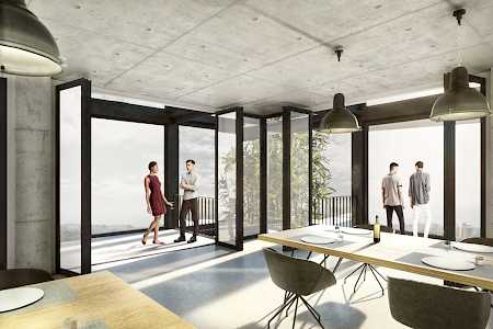 Im 7. Obergeschoss, an welches die Dachterrasse anschließt, wird das grobmaschige Raster angewendet um eine optisch störende Absturzsicherung im Außenbereich vermeiden zu können und den Hotelzimmern besondere Ausblicke zu ermöglichen. Die obersten drei Geschosse sorgen durch das unterbrochene Raster für einen spannenden Abschluss und betonen die Skybar und das Restaurant. Von dort aus hat man einen uneingeschränkten Blick über die Dächer Halles und kann auf den Terrassen, welche von der Fassade begrenzt werden, die Aussicht genießen. Die umlaufende Verglasung schafft einen hohen Anteil natürlicher Belichtung für einen hohen thermischen und visuellen Komfort der Arbeitsplätze, sowie der Hotelzimmer.