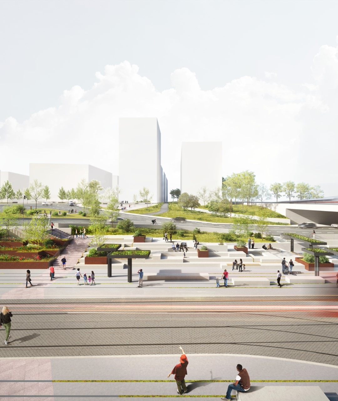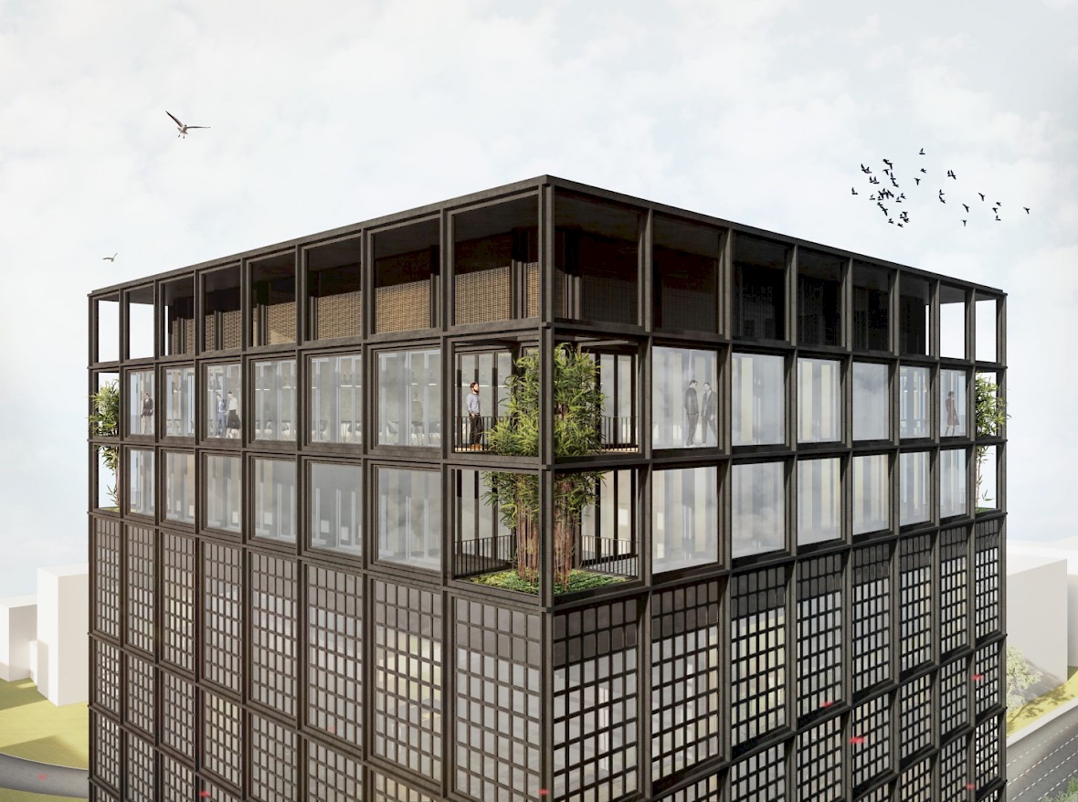 Die Konzeptidee der Fassade nähert sich an den urbanen Kontext des Bearbeitungsgebietes an. Der angrenzende Hauptbahnhof, sowie die Gleisanlagen der Straßenbahnen dienen als Inspiration. Es wird eine Pfosten-Riegel-Fassade vorgeschlagen, welche mit Aluminium Profilen als Hauptelement konstruiert ist. Die sich widerholenden vertikalen und horizontalen Profile erinnern an Gleise und greifen somit das von Urbanität geprägte Bild des Ortes auf. Die an den mannigfaltigen Verkehr angelehnte Farbwahl fügt den Neubau in den Kontext ein. Die gewählten Profile, sowie das Stützenraster ist auf die Kubatur des Gebäudes angepasst und prägt die Erscheinung des neuen Gebäudes. Die Fassade erreicht ihren Detailreichtum durch engmaschig gerasterte Sprossenfenster. So entsteht ein Fassadenbild mit räumlicher Tiefe. Die hohe Plastizität der Konstruktion kommt insbesondere in der Fernwirkung zur Geltung und spielt mit der Maßstäblichkeit. Sie strahlt Ruhe und Geradlinigkeit in dem hektischen Umfeld aus und verstärkt so den Ausdruck des Baukörpers im Stadtbild.