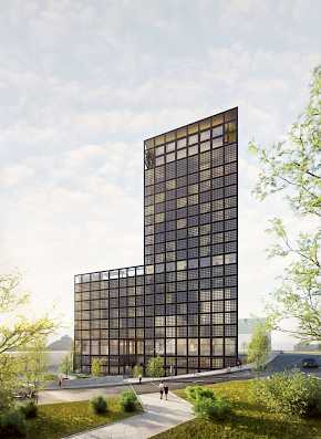 Äußere Gebäudegestaltung und Einbettung in den öffentlichen Raum unter Berücksichtigung von begrünten Flächen und Nachhaltigkeitsgesichtspunkten, Konferenzhotel und Büro in Halle an der Saale.
