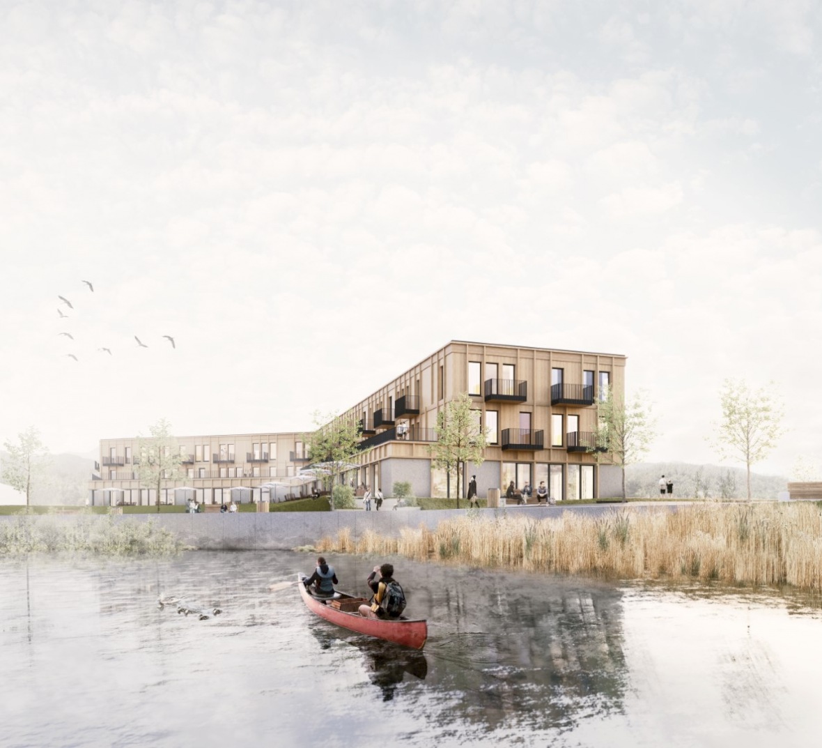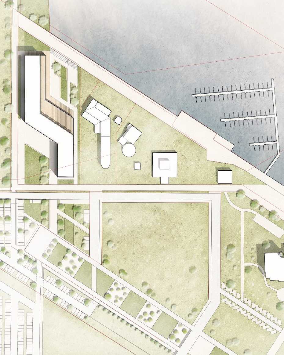Die bestehende kleinteilige Bebauung durch Einzelbausteine wie die Bernsteinvilla, das Restaurant Seeblick“ und den Marinapark lässt das Gebiet auseinanderbrechen. Es fehlt ein eindeutiger Abschluss der Baufelder in Richtung Norden. Der Entwurf reagiert auf diese Problematik und setzt eine klare bauliche Kante zur nördlichen Bundesstraße. Der Ausgangspunkt einer durchlaufenden Kante wird durch partielles Einschieben der längsseitigen Gebäudefluchten gebrochen. Es entsteht eine S-Form. Der Mittelsteg greift die Uferkante auf und ermöglicht so die Orientierung der größtmöglichen Anzahl an Nutzungseinheiten in Richtung Wasser. Vor allem die Einheiten in den Obergeschossen können so einen 3-seitigen „Über“-Blick auf den Großen Goitzschesee genießen. Die Einzigartigkeit des Gebietes wird so optimal ausgenutzt. Die Kantenbildung zur Straße reduziert weiterhin die Lärmemission der Bundesstraße über das Planungsgebiet hinaus auf alle anderen rückwärtigen Baufelder.