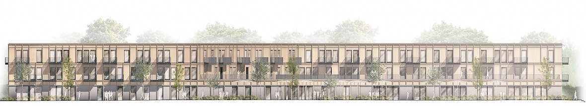 Zum Einsatz kommen Betonfaserplatten, welche das Sockelgeschoss ausbilden sowie eine umlaufende (nachhaltige) Holzverkleidung in den Obergeschossen. Die Zuordnung der Materialien macht die dahinterliegende Nutzung sichtbar und gliedert das Gebäude horizontal.