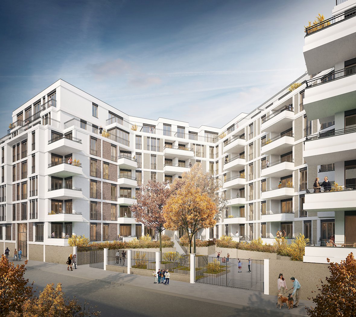 Während sich die Kubatur entlang der Beuthstraße als geschlossene Blockrandbebauung entwickelt, ist der Straßenzug an der Kommandantenstraße gen Süden bewußt aufgeweitet worden. Der hier entstandene städtische Patio ermöglicht eine Adressbildung und für alle Wohneinheiten eine adäquate Besonnung. Die städtebauliche Figur wird im Norden durch einen Querriegel verbunden. Die somit entstehenden drei Höfe weisen individuelle Qualitäten auf.