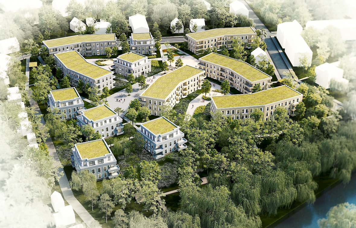 Geplant sind der Neubau von drei Quartieren mit insgesamt 12 Gebäuden, unterteilt in sechs Stadtvillen und sechs Wohnriegeln, auf dem 28.500 qm großen Grundstück direkt am Nottekanal.