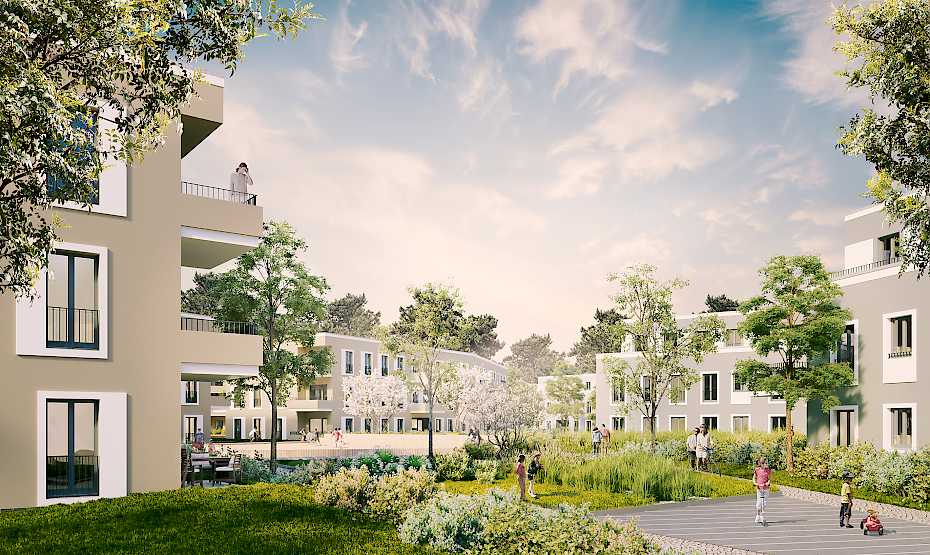 Die Städtebauliche Grundkomposition ermöglicht die Entstehung eines zentralen Nachbarschaftsplatzes mit Sitzelementen und Spielbereichen, während sich die Gebäude der einzelnen Quartiere um einen privaten und geschützten Innenhof formieren. Der Nachbarschaftsplatz, welcher sich zentral durch das gesamte Wohnquartier von West nach Ost erstreckt, lädt zum gemeinsamen Verweilen ein. Hier ordnen sich ein Community Garden, eine Tribüne sowie Spiel- und Sportstätten an. So entsteht ein Ort des Miteinanderseins, des gemeinsamen Lebens.