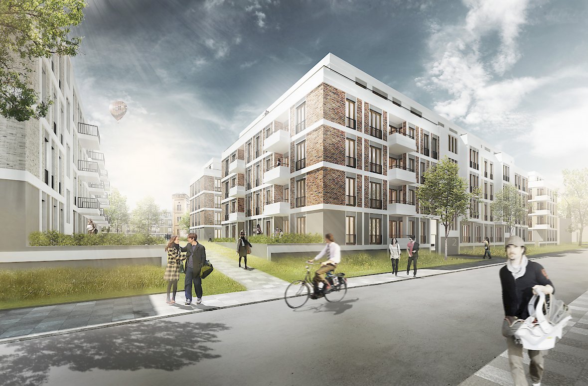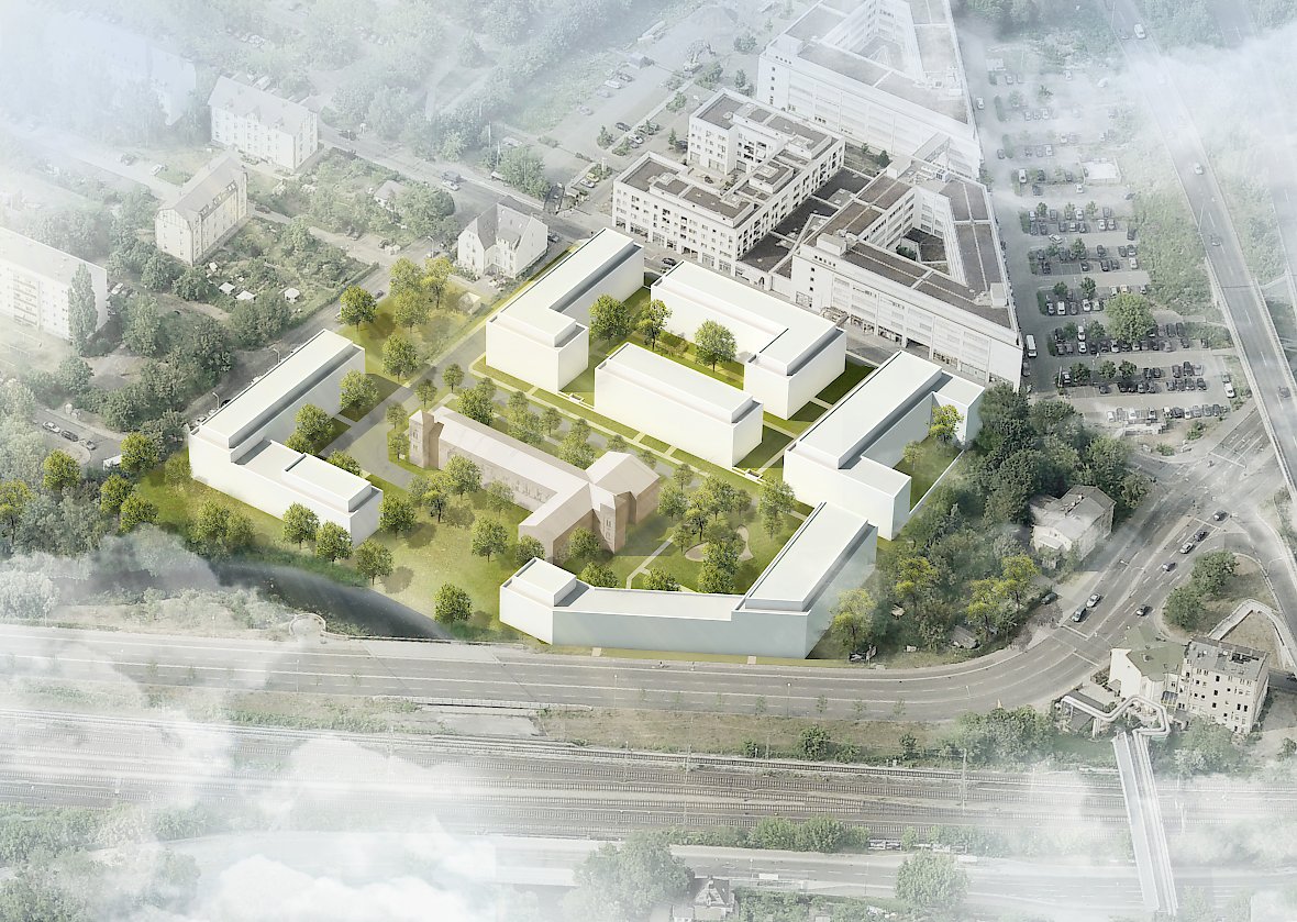 Der Entwurf sieht eine offene Blockbebauung vor, die das Areal an seinen Grenzen sinnvoll fasst. Im Südosten bilden die beiden Studentenwohnheime als Einheit einen starken Auftakt. Zur Lotte-Pulewka-Straße wird das Ensemble durch drei Wohnhäuser fortgeführt, welche sich um einen halböffentlichen Hof gruppieren. Den Abschluss nach Südwesten bilden drei freistehende Einzelbaukörper. Idee ist, Räume zwischen den Bestandsgebäuden und den Neubauten auszubilden und somit ein zusammenhängendes Ensemble zwischen Neu und Alt zu schaffen.